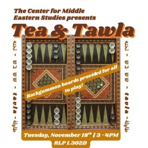 You’ve likely heard about or seen the game Backgammon- also known as tawla, tavla, shesh besh, and takhteh, among other names. Join the Middle Eastern Studies faculty and community for Tea & Tawla, a fun hour of learning, gaming, and sipping tea! You will hear about the history and cultural significance of Backgammon in the Middle East, then learn the rules and play the game together.