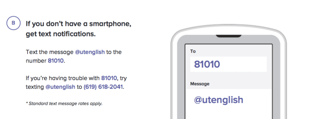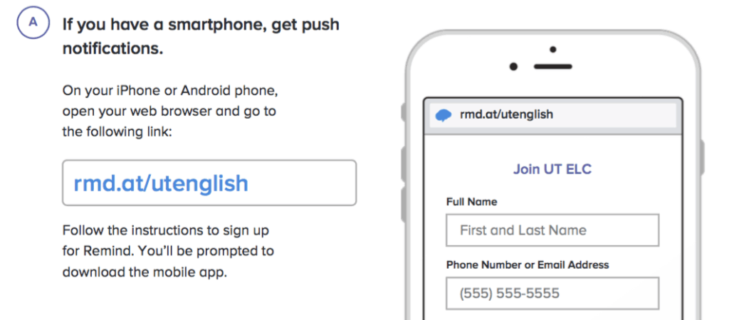 - Visit rmd.at/utenglish (will link to https://www.remind.com/join/utenglish).